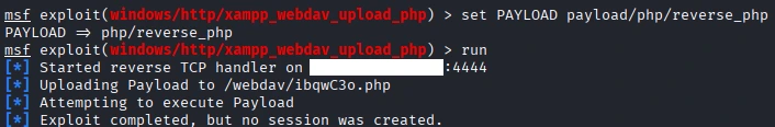 This module can be found in Metasploit and it exploits weak WebDAV passwords on XAMPP servers. It uses supplied credentials to upload a PHP payload and executes it. Let's exploit the server.