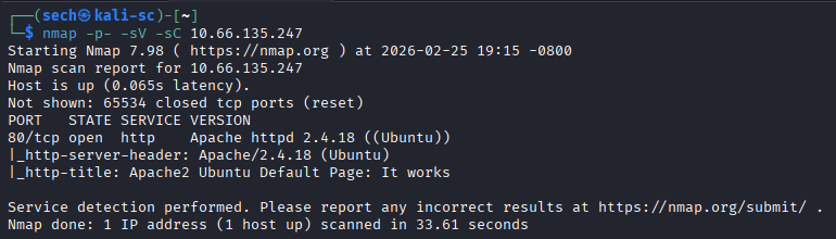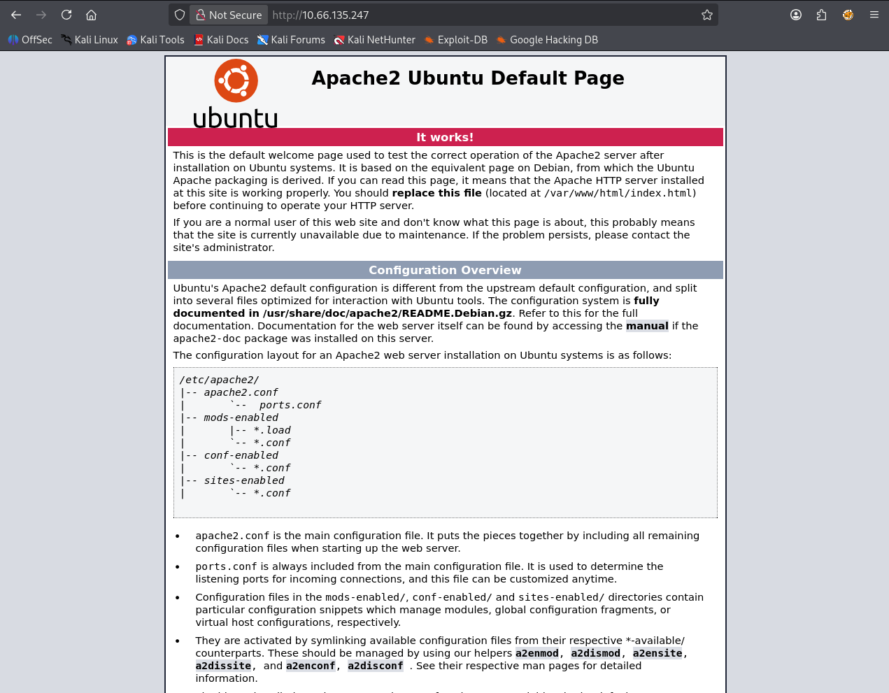 It seems that port 80 is the only port that is open. I then accessed the target IP through the browser and was presented with the default Apache page.