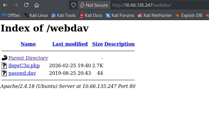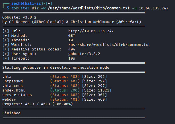 I used Gobuster for directory enumeration to find any hidden directories that we can access. The only one that caught my eye is a directory called /webdav. Here are the results: