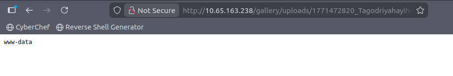It provides us with the shell URL. I copied the link and accessed it through the browser. It seems that the login bypass was a success and when reviewing the URL, it is using the whoami command.