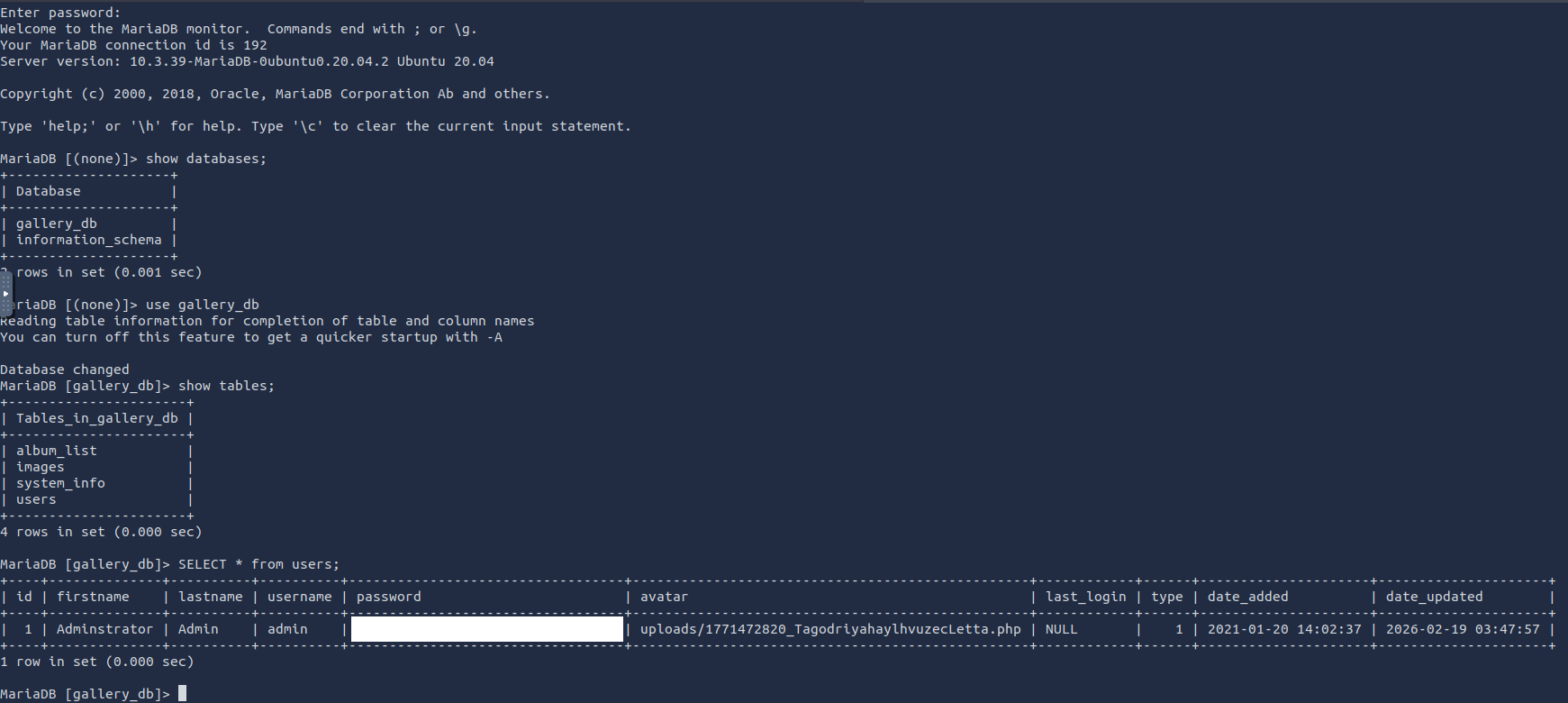 Now that I have a usable terminal, I can continue investigating. When reviewing all the files in the uploads directory, there was nothing I found helpful. I went back a directory (gallery) and found config.php. Here are the contents: