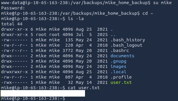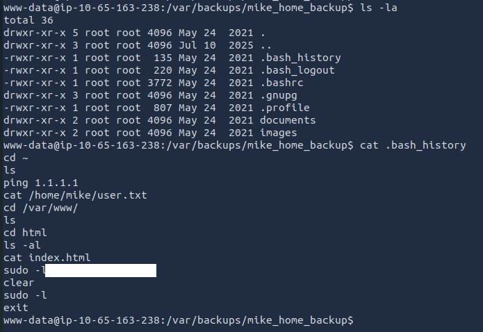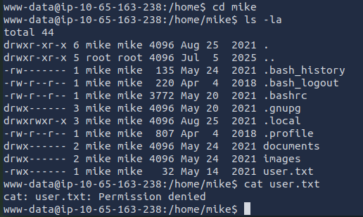 Looks like there is a user.txt file. I believe this is the file that contains the user flag. I attempted to read the file and got a permission denied error message. I forgot that I am still logged in as www-data so it is standard for me to get that error message as that file does not belong to me.